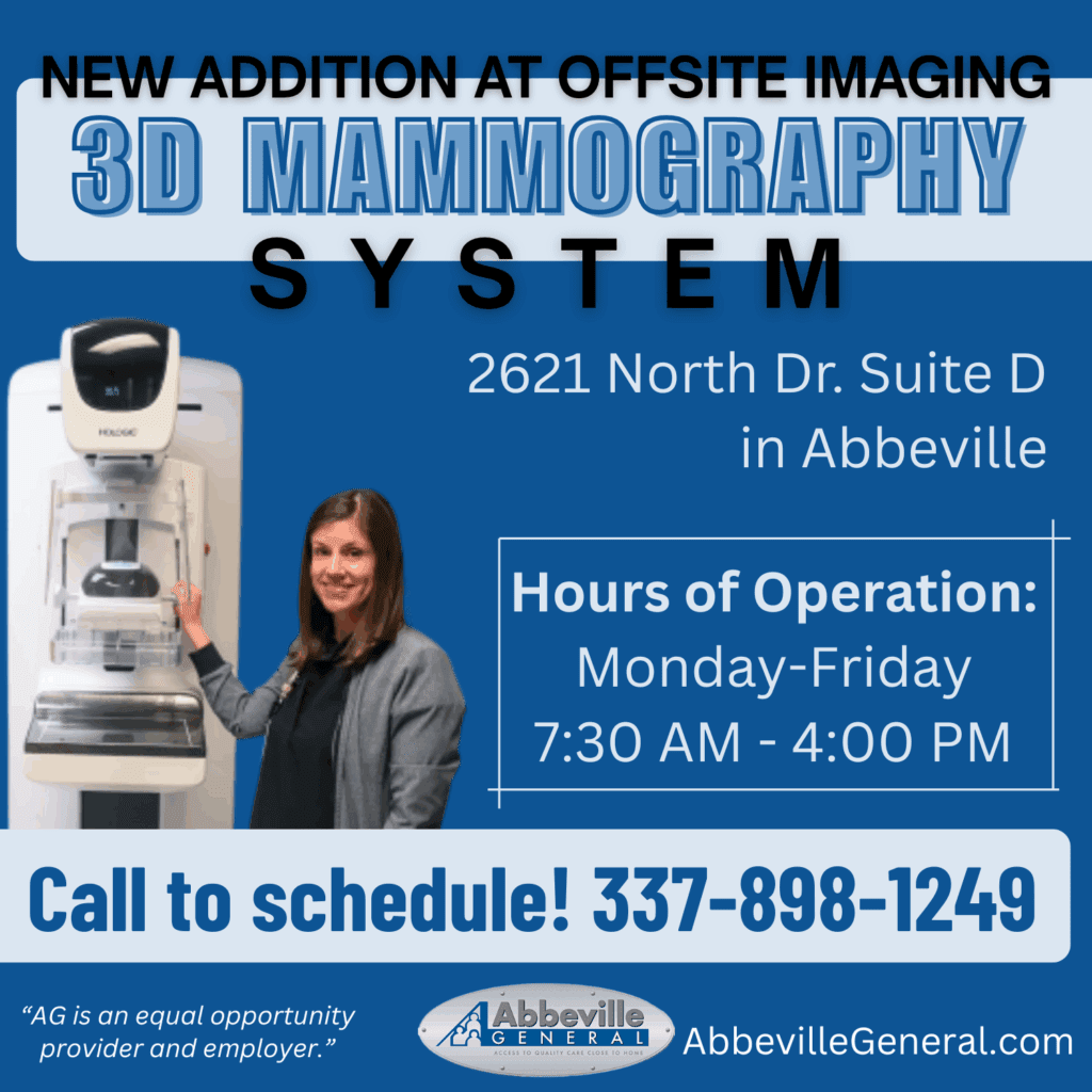 Abbeville General is excited to announce that Offsite Imaging has acquired a new additional 3D Hologic Mammography System!